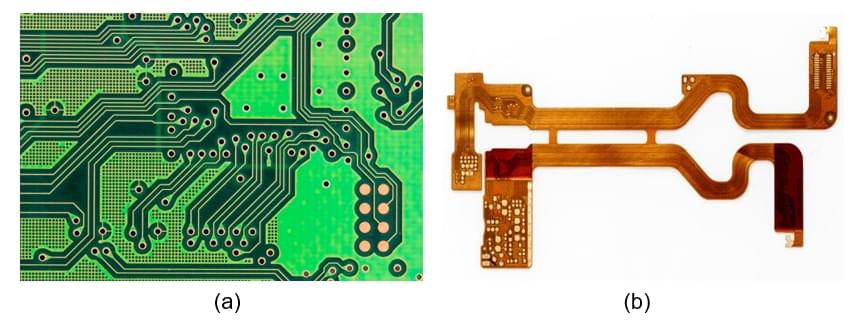 軟式電路板(FPCB:Flexible PCB):一般使用聚對苯二甲酸乙二酯(PET)或聚亞醯胺(Polyimide)制作,再將銅導線制作在電路板上,如<圖三(b)>所示,軟式電路板最大的特色是「可以活動」,因為它是軟的,其實PET就是制作寶特瓶所使用的材料,有點硬中帶軟,所以制作完成以后可以撓成各種形狀,如果兩塊硬式電路板之間要連接起來,但是又要可以來回伸縮活動就必須使用軟式電路板,目前廣泛應用在消費性電子產品,例如:筆記型電腦的液晶螢幕、折疊式手機、數位相機、光碟機、硬碟儲存設備等。