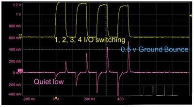 如下圖所示,接地反彈可將接地電勢更改為數(shù)字電路可能發(fā)生故障的水平。例如,將“ 0”解釋為“1”會導致觸發(fā)器改變狀態(tài),晶體管關閉或?qū)ā?/span>